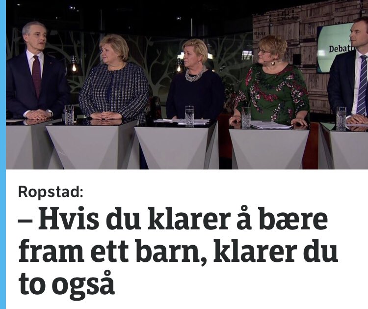Klarer du å bære fram ett barn klarer du to sa Ropstad under den direktesendte partilederdebatten som ble sendt kort tid etter at KrFs la. Venstre-leder Trine Skei Grande og KrF-nestleder Kjell Ingolf Ropstad under debatten på NRK torsdag kveld. Etter flere måneders venting på at andre land skulle gå foran er Norge snart klare til å relokalisere barn og barnefamilier fra.
